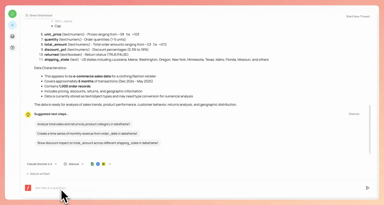TL;DR: September was a big month at Fabi.ai. We launched a new full-screen chat mode that lets you move seamlessly between quick Q&A and structured Smartbooks, making analysis more flexible than ever. We also rolled out GitHub integration so data teams can bring version control, CI/CD, and collaboration best practices into their analytics. On top of that, we added new connectors like Coda and Firebolt, made it easier to see and add data sources directly in the AI Analyst, and delivered a set of performance boosts including, faster apps, smarter spreadsheet handling, and access to the latest Claude 4.5 model.