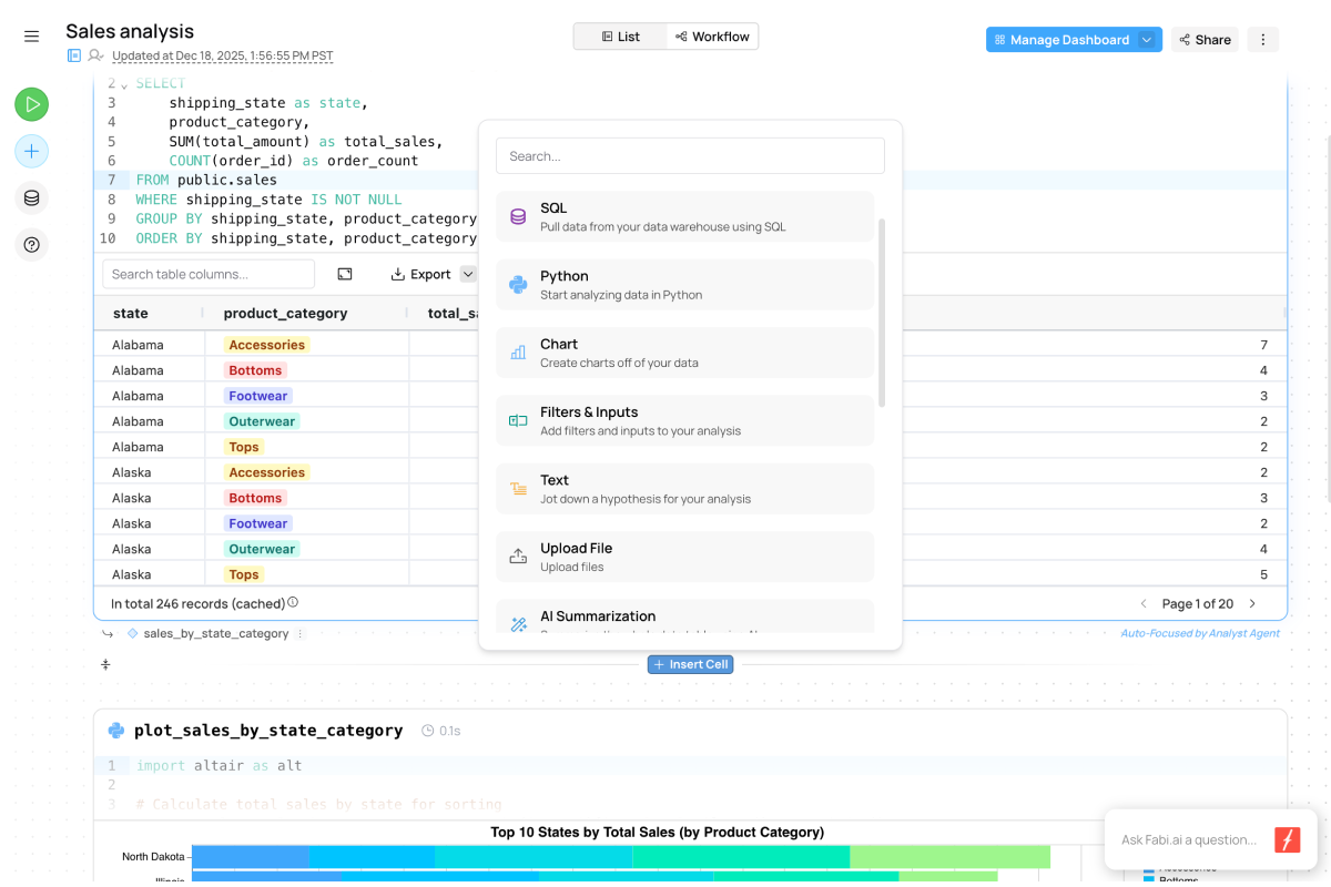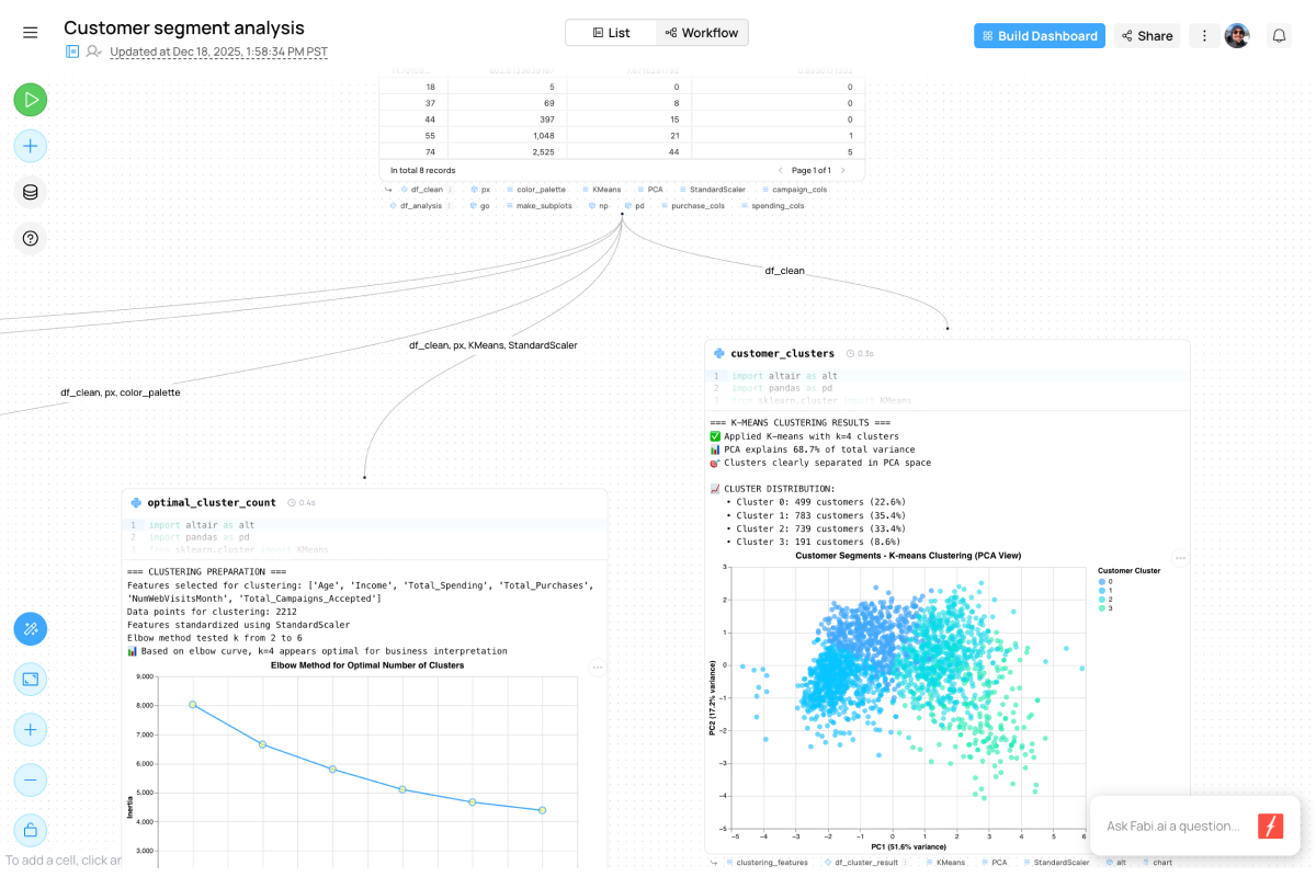 Fabi.ai Smartbooks are designed to handle complex questions no matter how organized your data is. The AI agent can reason through problems using hyper-aware context, and the analyst remains in full control with the ability to edit the AI-generated code.