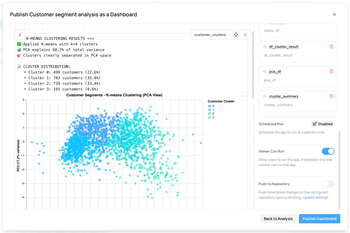 Simply click the "Create Dashboard" button in your AI notebook. Your analysis automatically becomes an interactive dashboard that can be scheduled to run regularly and shared with stakeholders. No additional coding required.