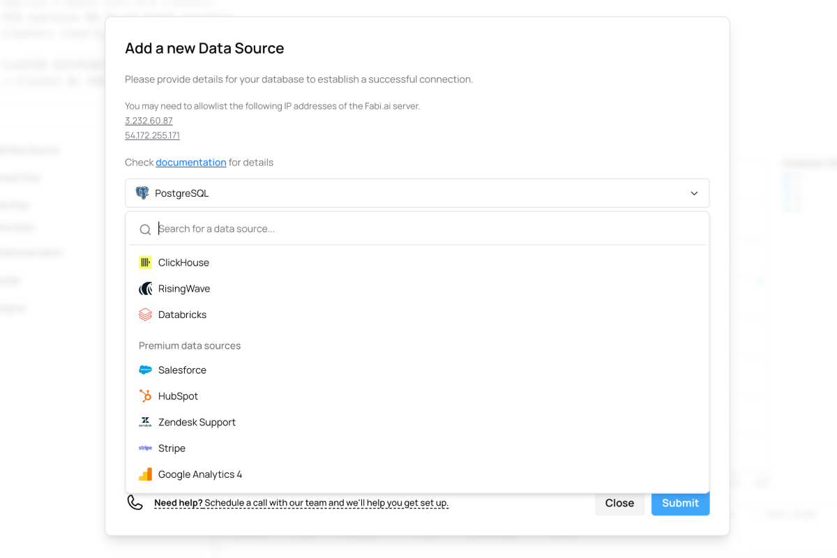 With thousands of database, data warehouse and application connectors, Fabi works with all your data. No more exporting or copy-pasting data and spreadsheets.